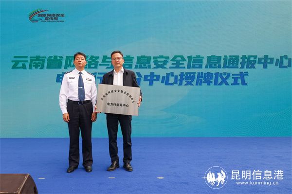 昆明信息港讯 记者合宇聪 9月8日上午,云南省2022年国家网络安全宣传周法治日线下活动在昆明市西山碧鸡文化广场举行。活动中,参会领导为云南省网络与信息安全信息通报中心电力行业分中心进行授牌,并为云南网警志愿者代表颁发聘书。